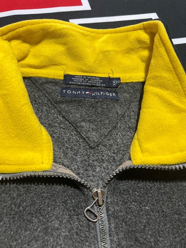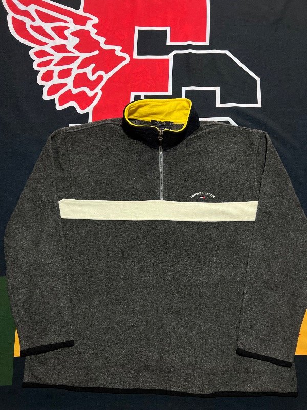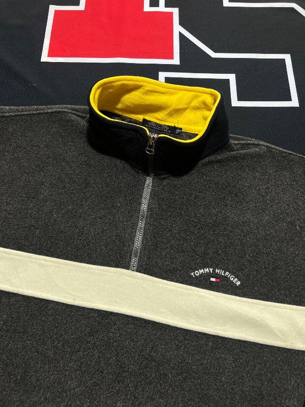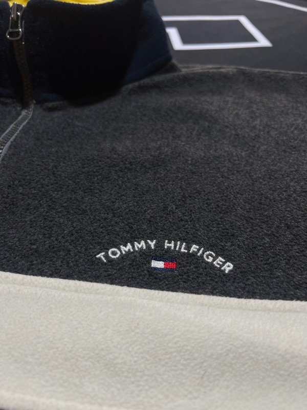 Buzo polar Tommy Hilfiger bicolor, gris oscuro y blanco. Prenda vintage.