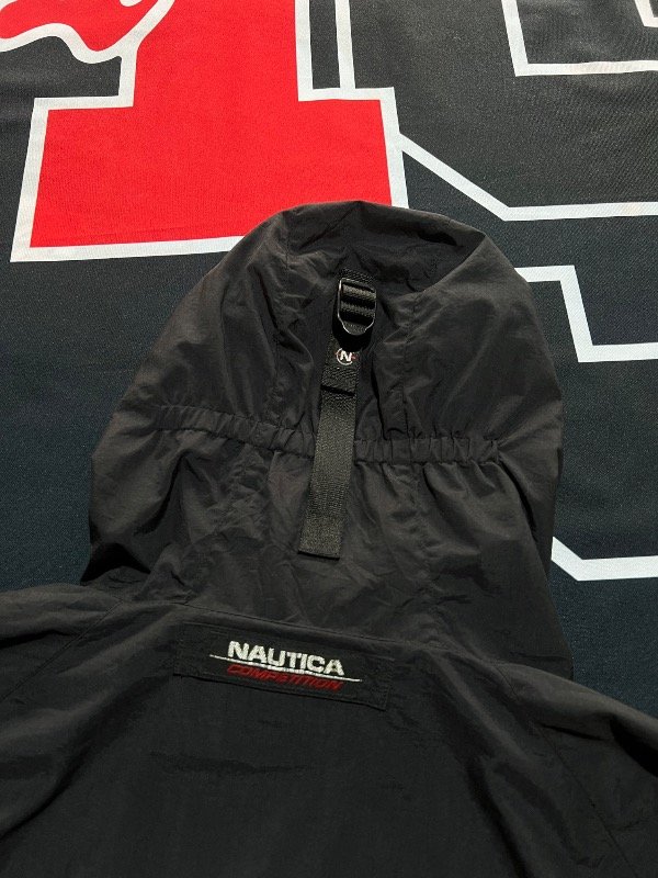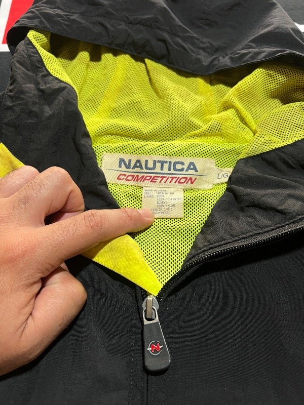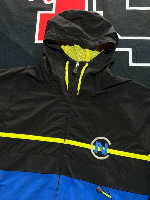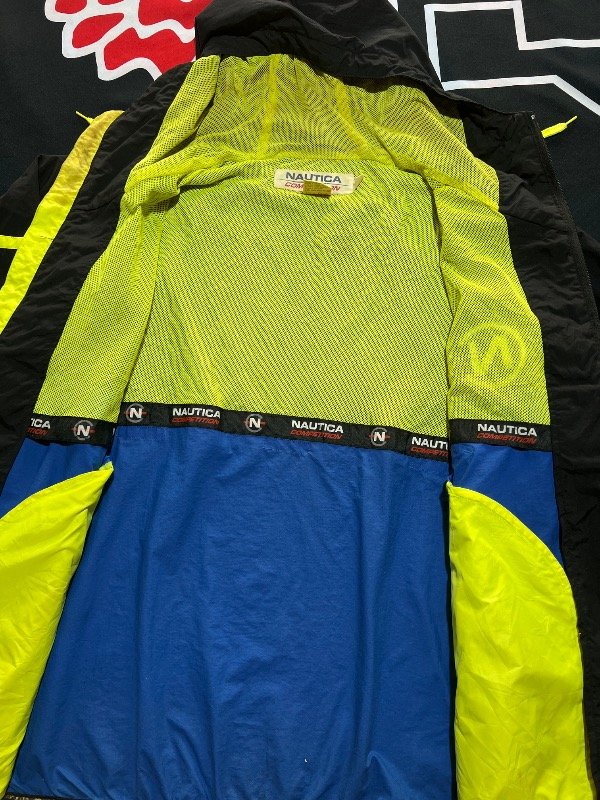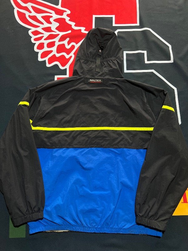 Campera Náutica Competition Tricolor (Negro, azul y amarillo). Rompeviento, tiene ajustador de capucha y 2 bolsillos. Prenda vintage