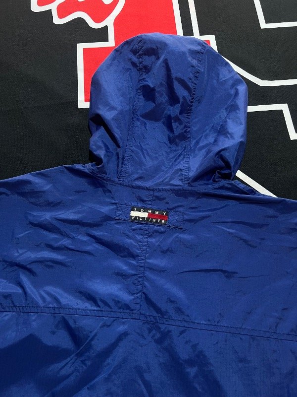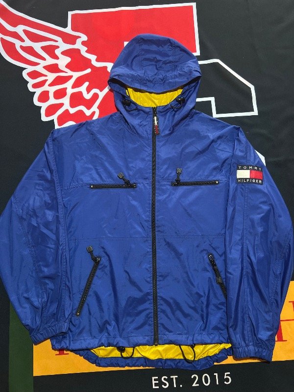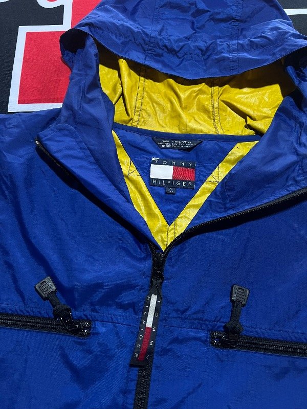 Campera Tommy Hilfiger vintage. Rompeviento azul, parche bordado.