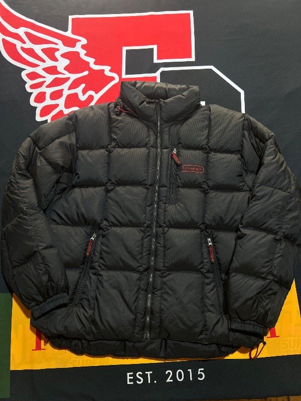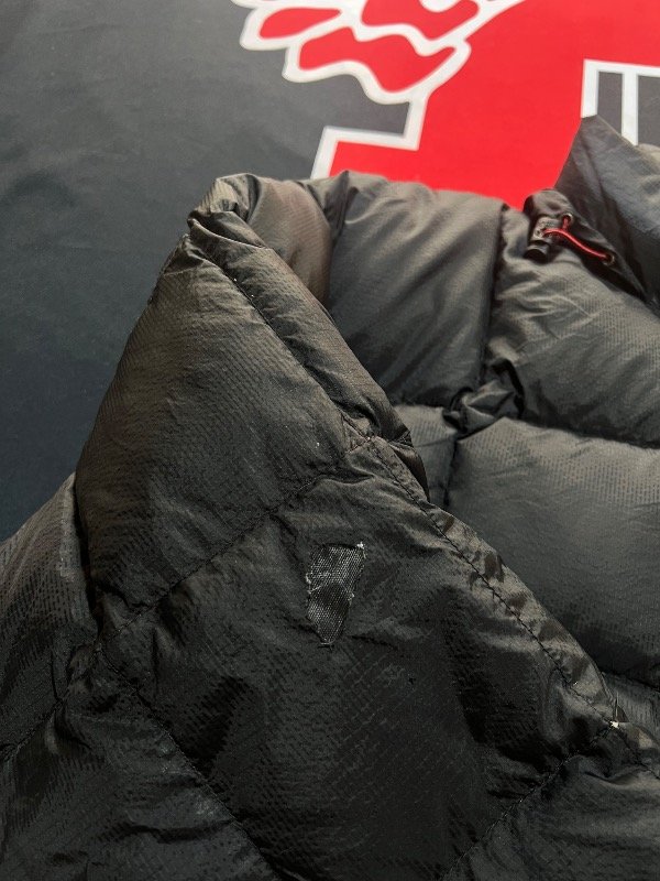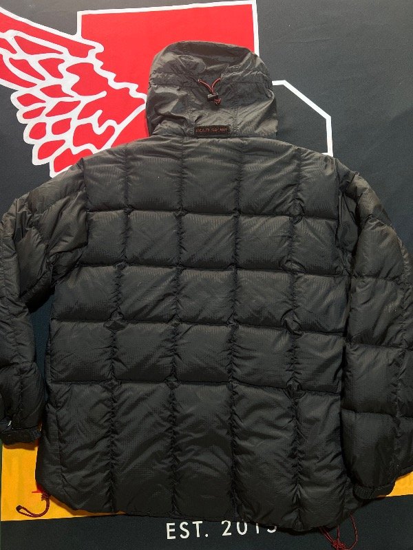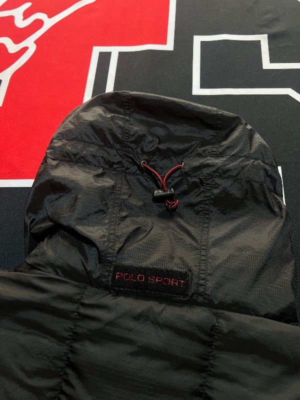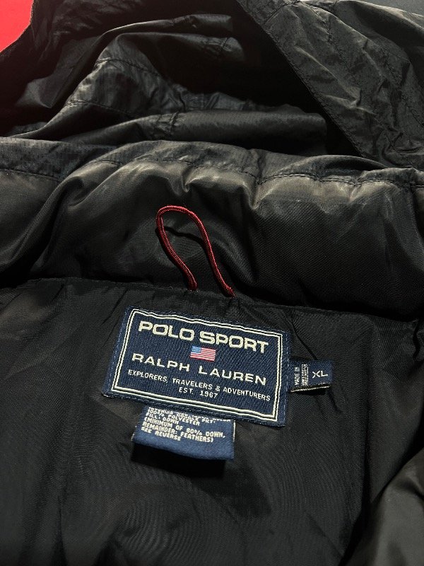 Puffer Polo Sport negro, detalles rojo. Tiene capucha, ajustador de muñecas y cintura. De plumas.