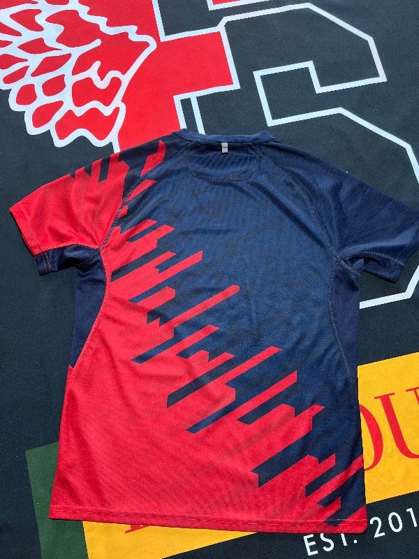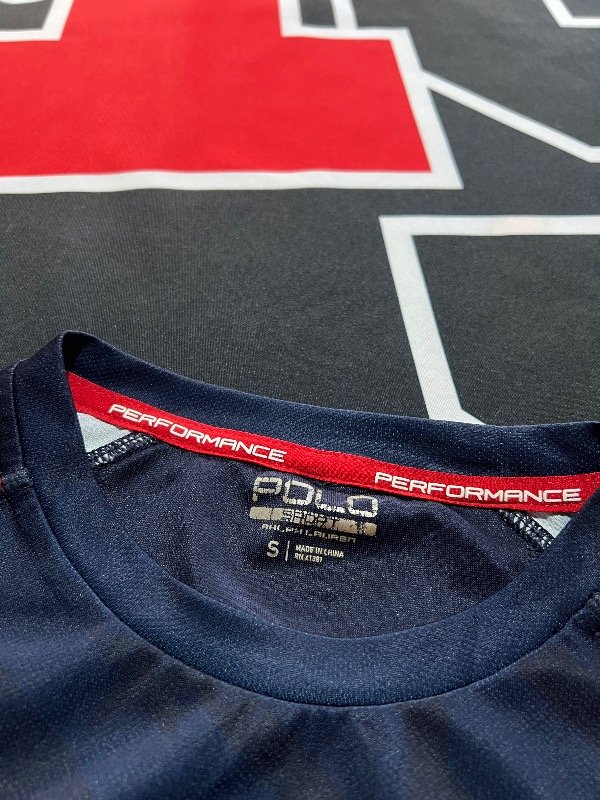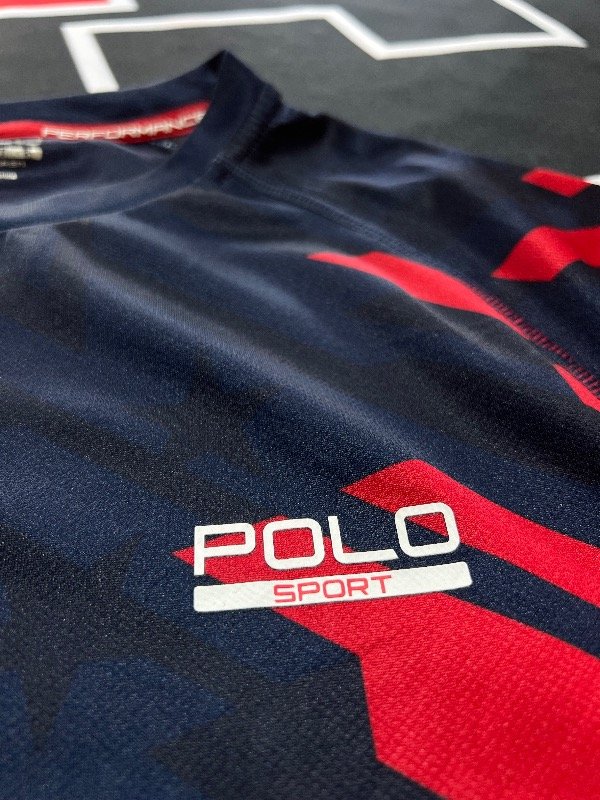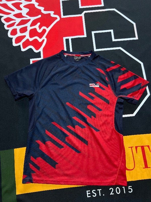 Remera Polo Sport bicolor, azul oscuro y rojo. Línea performance, algodón deportivo.