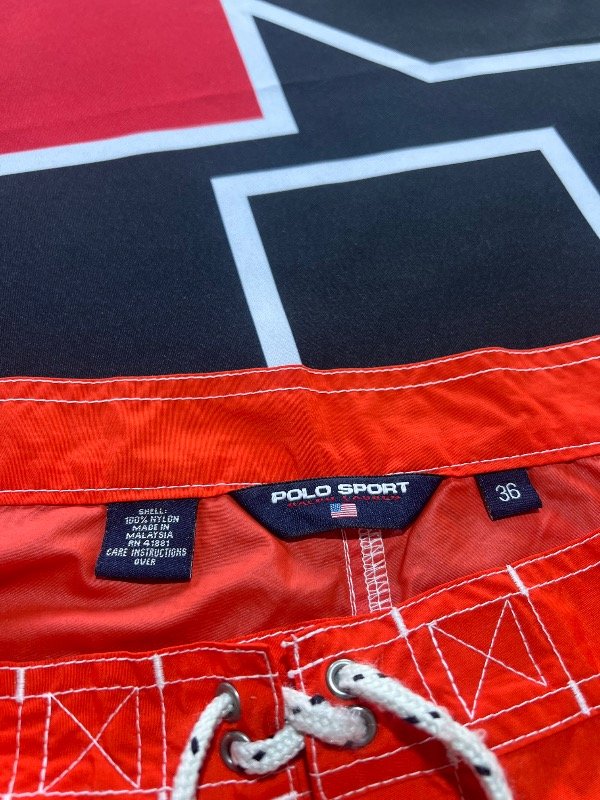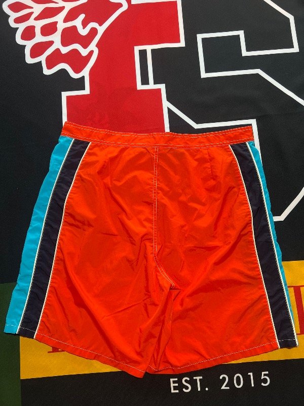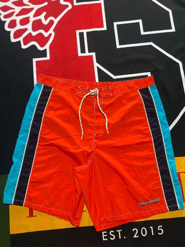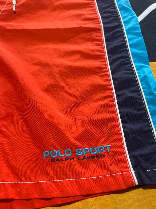 Short de baño Polo Sport tricolor (naranja, azul oscuro y celeste). No tiene bolsillos. Prenda Vintage.