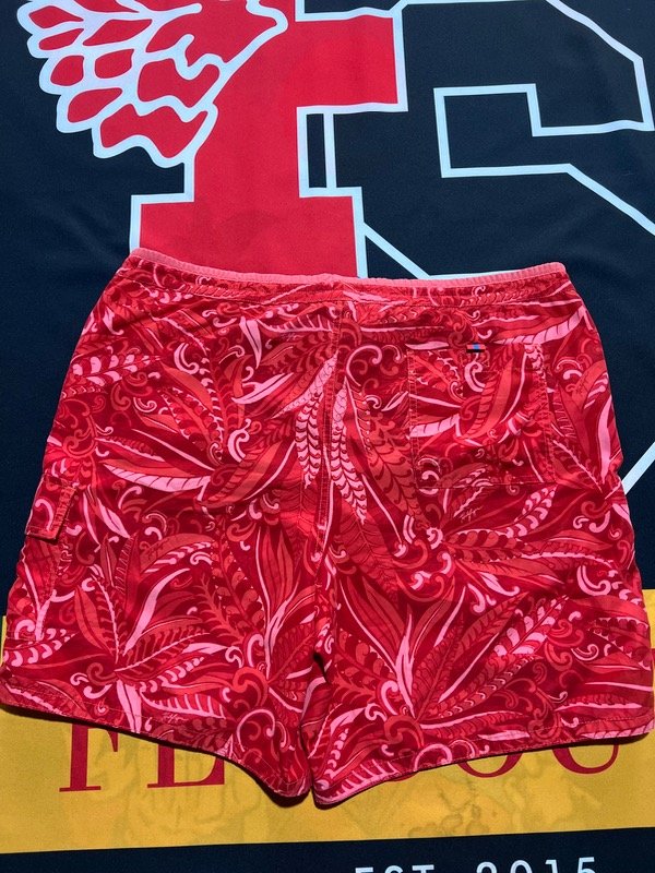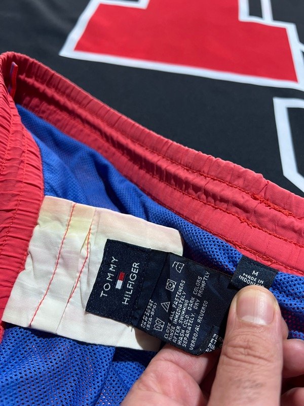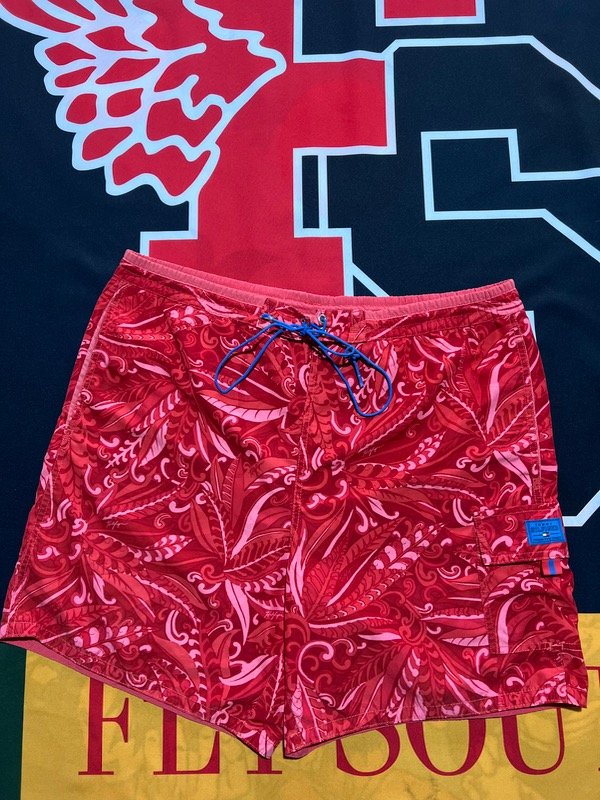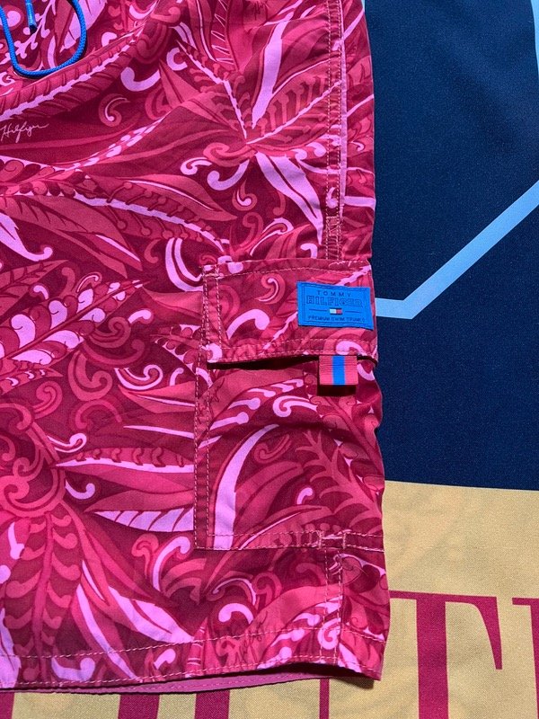 Short de baño Tommy Hilfiger hawaiano, gamas de rojo. Prenda vintage.