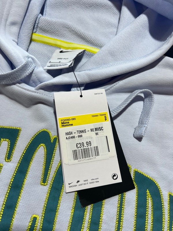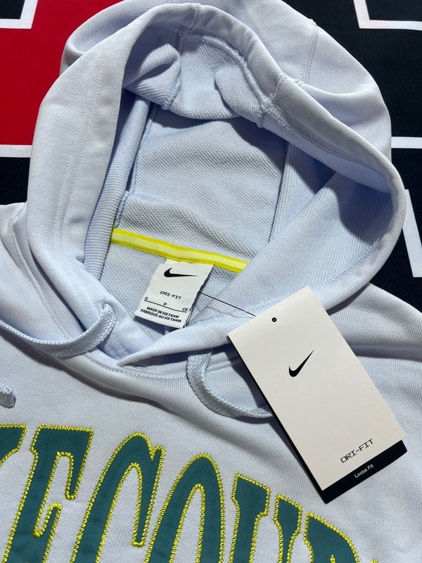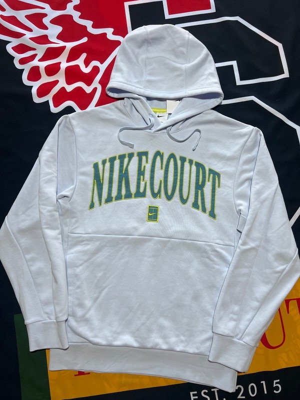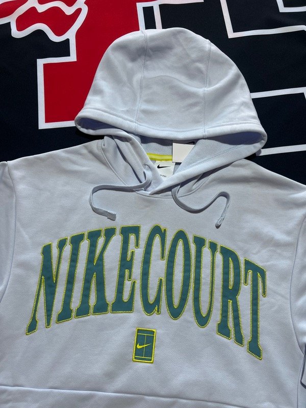 Buzo Nike Court celeste claro, de algodón. Letras bordadas.