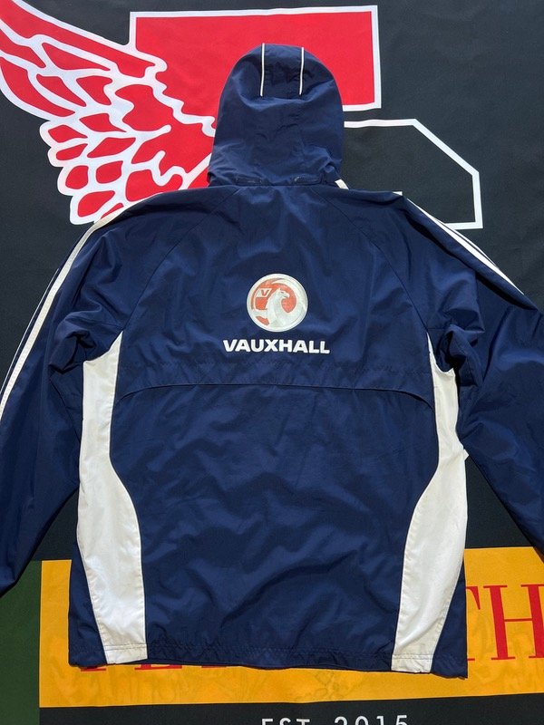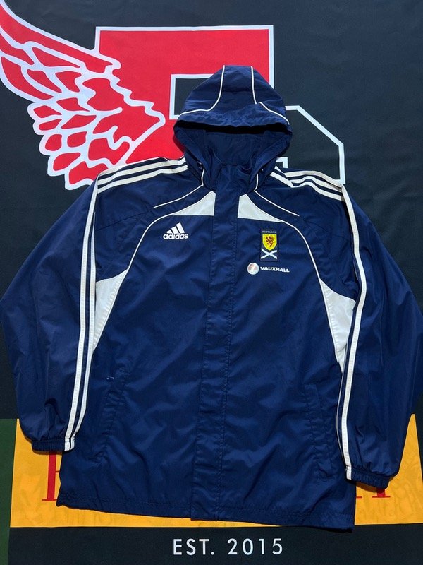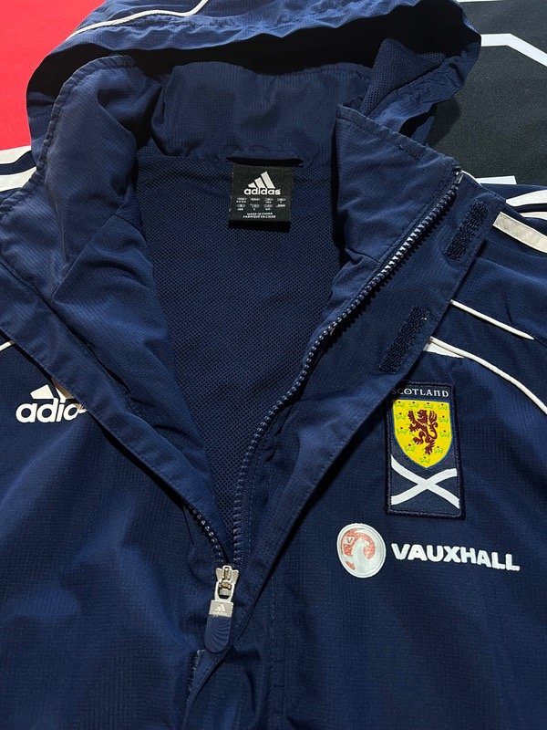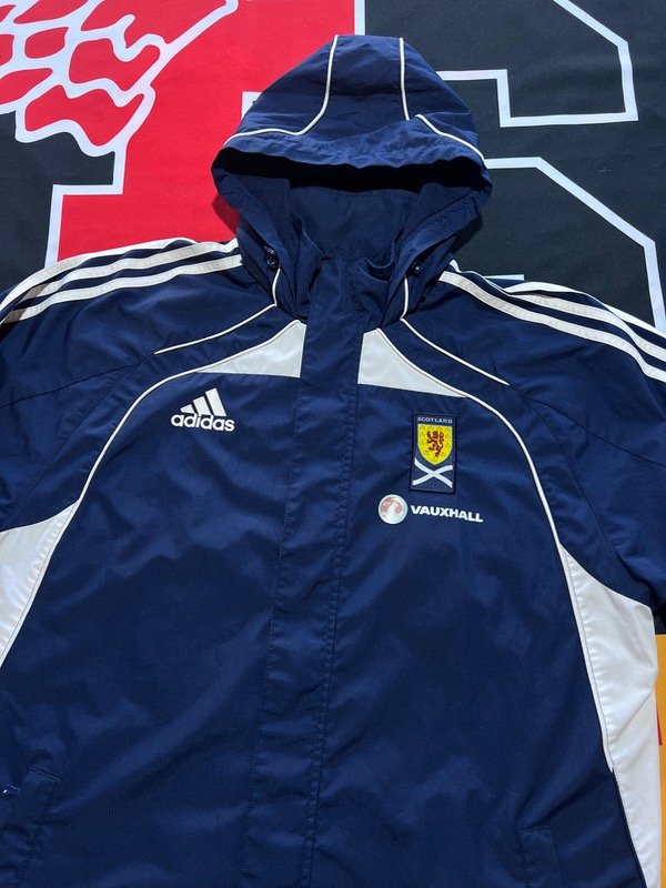 Campera Adidas x Escocia, rompeviento grueso. Tiene ajustador de cintura y capucha (se puede guardar en el cuello). Prenda de utileria.
