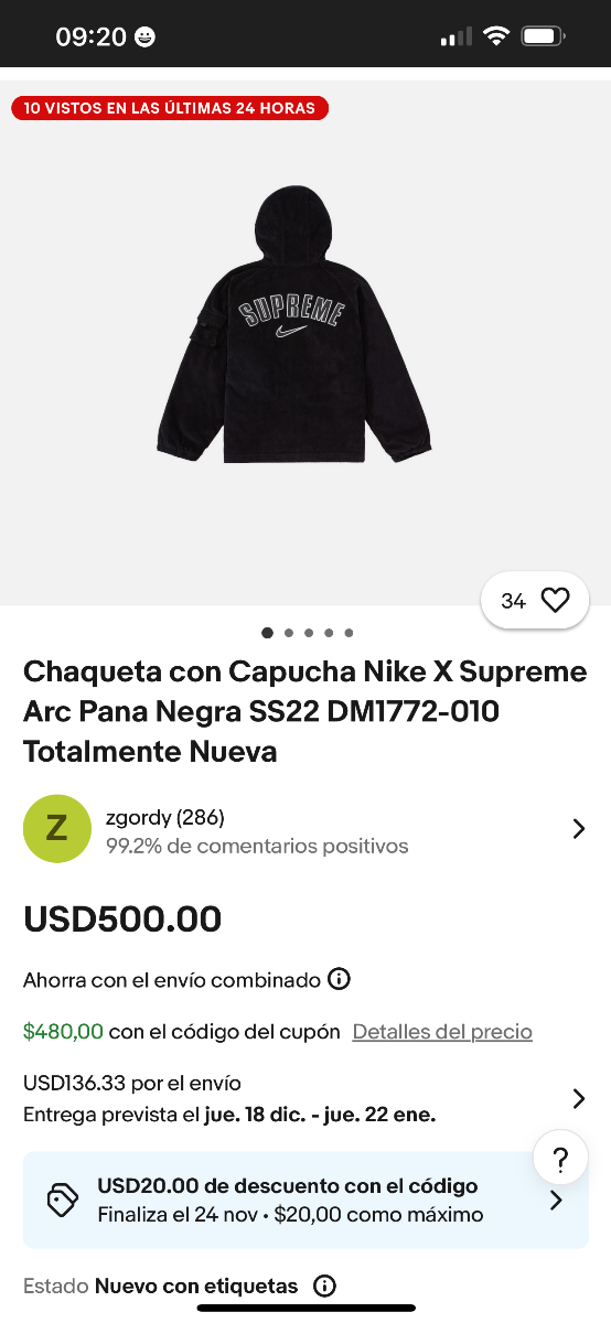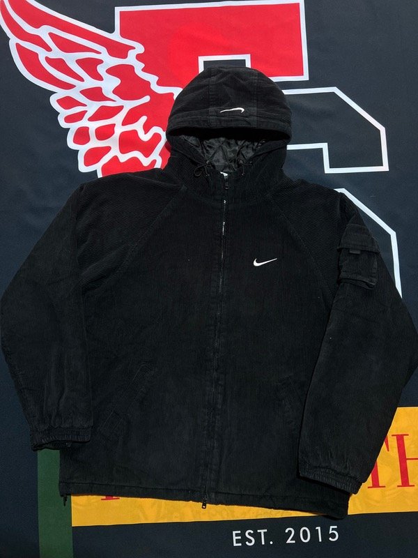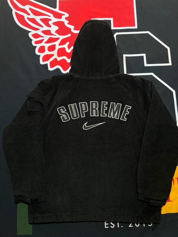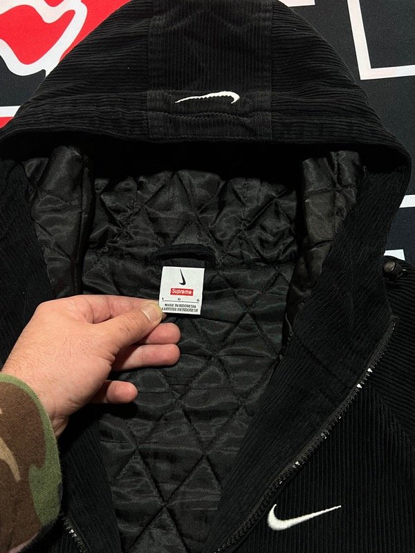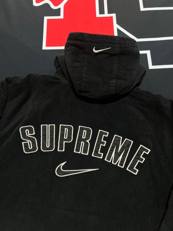 Campera Nike x Supreme, negra de corderoy. Camperon de abrigo, tiene relleno. Tiene ajustado de cintura, puños y capucha.