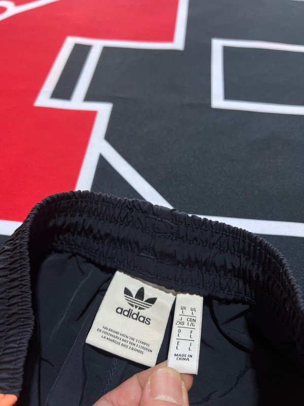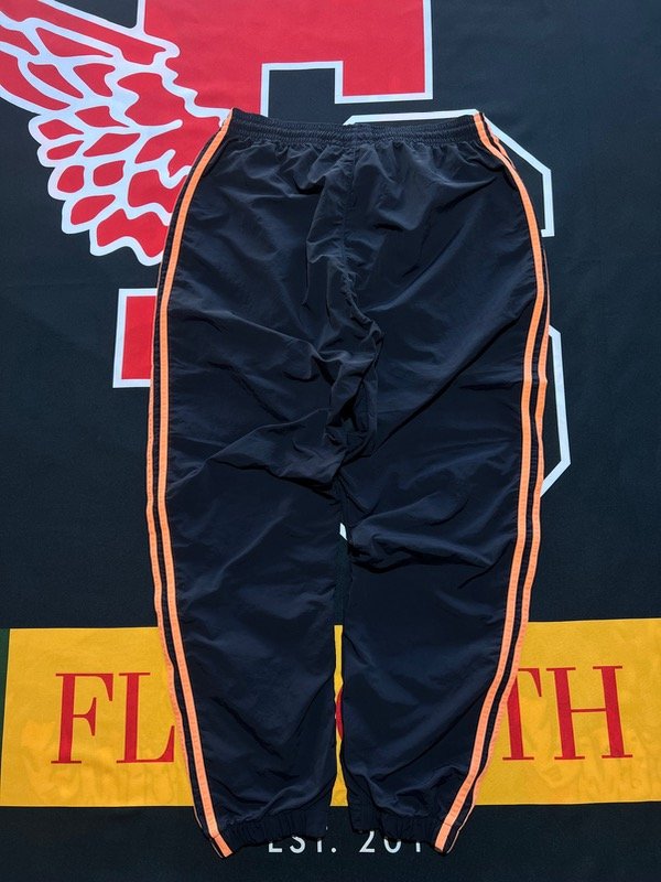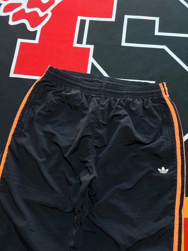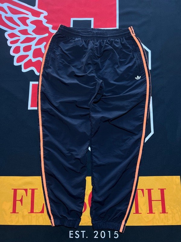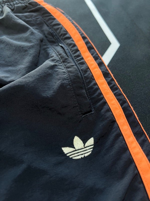 Pantalón Adidas Original, rompeviento azul oscuro, líneas color coral. Tiene bolsillos con cierre, puño en los tobillos y ajustador de cintura.