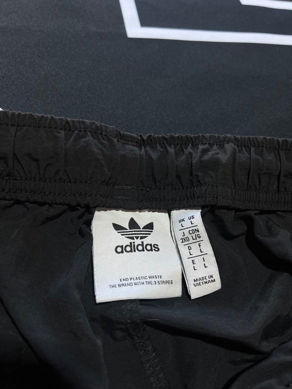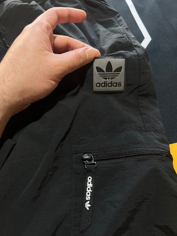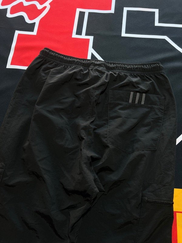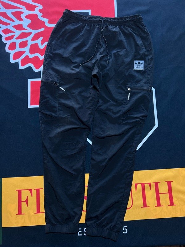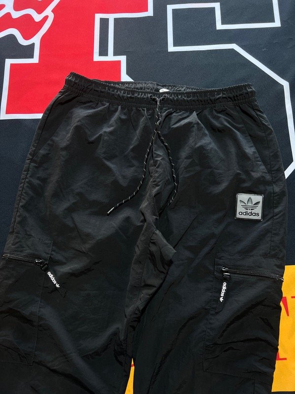 Pantalón cargo Adidas Original, rompeviento negro. Tiene 2 bolsillos laterales, 2 cargo, ajustador de cintura y puño en los tobillos.