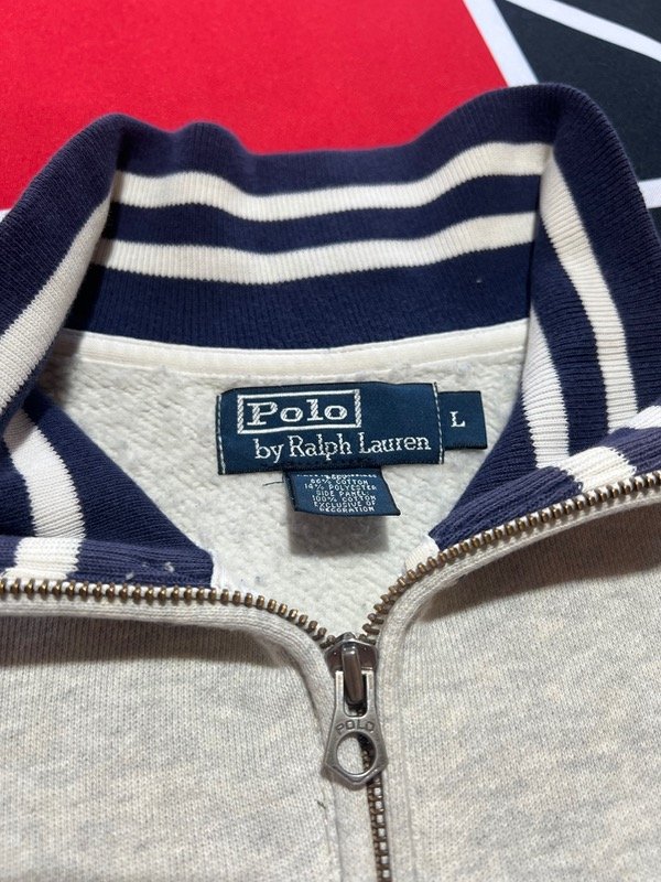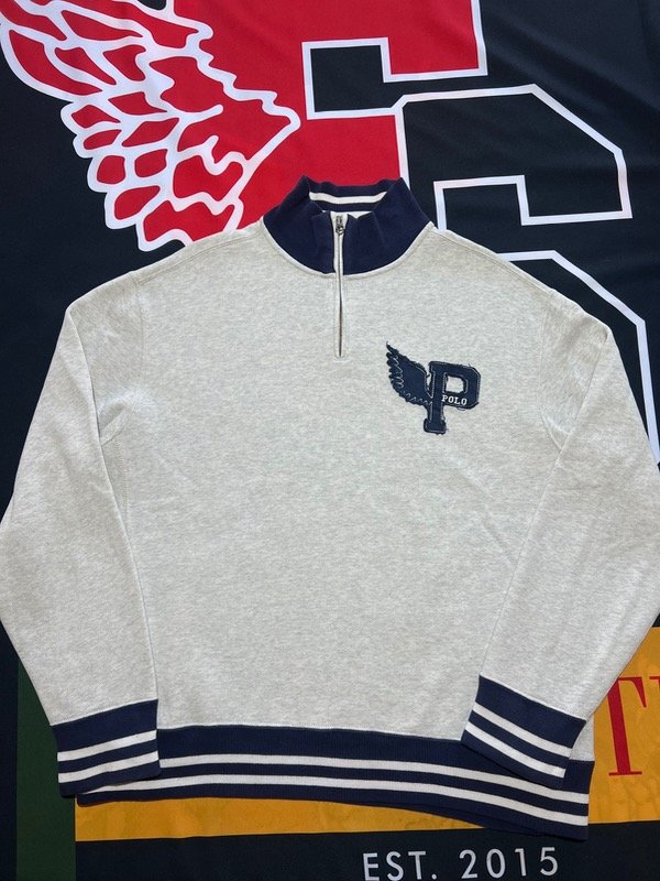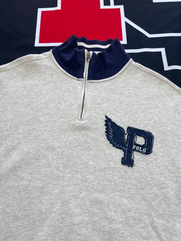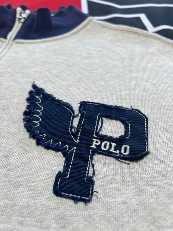 Buzo Polo Ralph Lauren P-wing, de algodón. Color gris hueso, detalles azules oscuros. Prenda vintage.