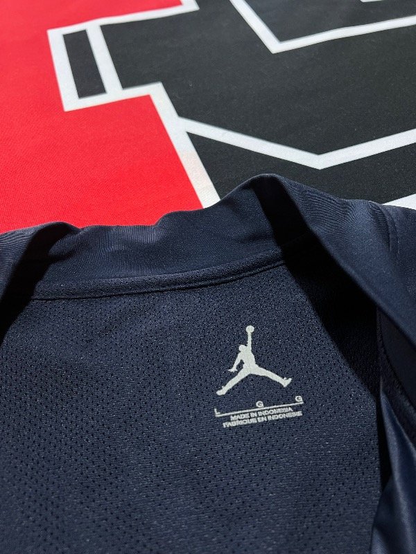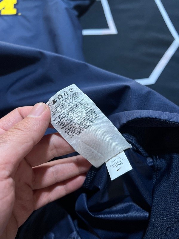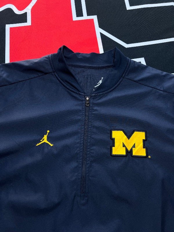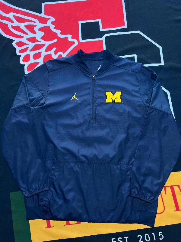 Anorak Jordan x Michigan Wolverines edición 2021. Color azul oscuro, rompeviento. Tiene bolsillo canguro.