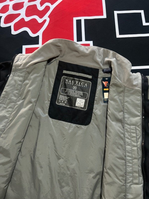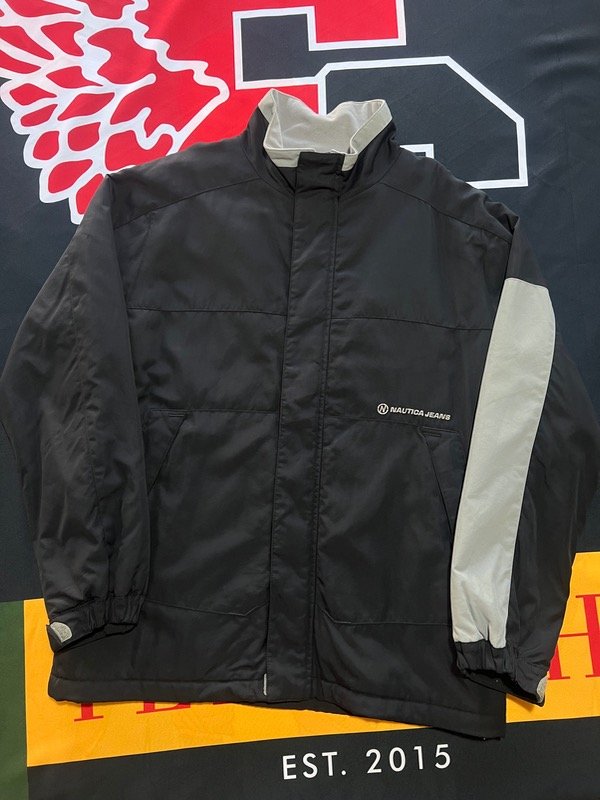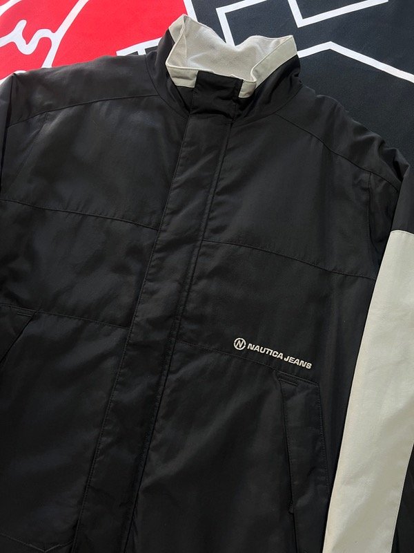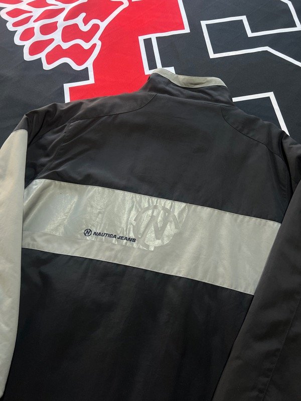 Campera Náutica Jeans negra y gris. Rompeviento, tiene relleno, es bastante abrigada. 2 bolsillos frontales y 1 interno. Tiene ajustador de cintura y muñecas. No tiene capucha.