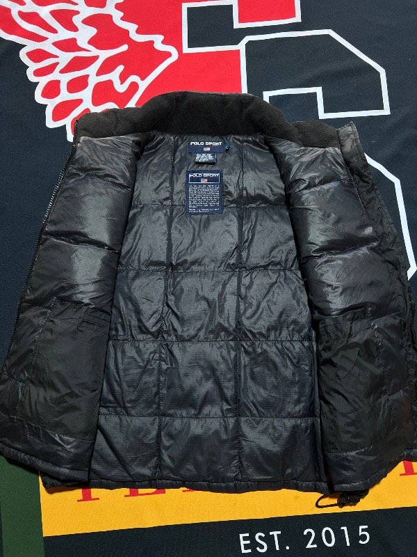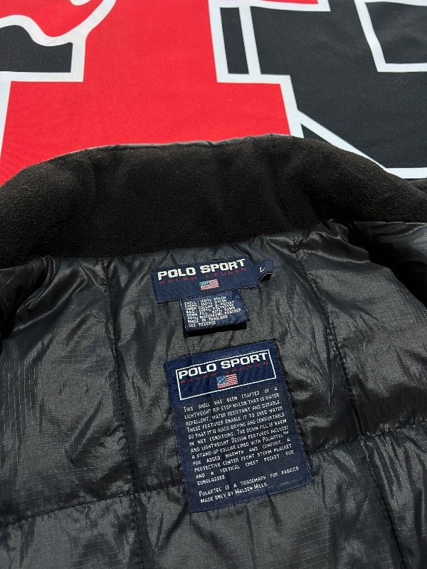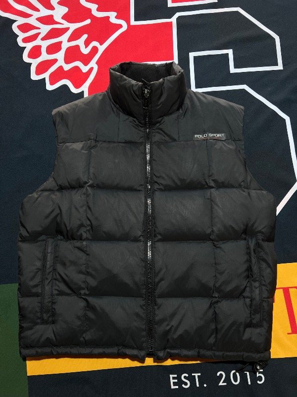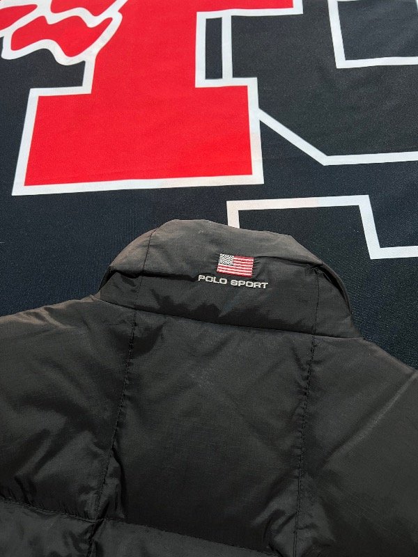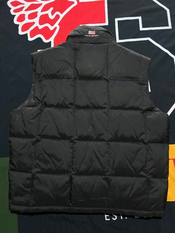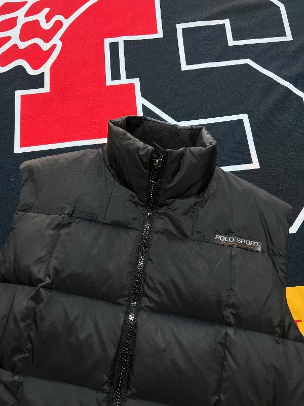 Chaleco Polo Sport vintage, de plumas, color negro.