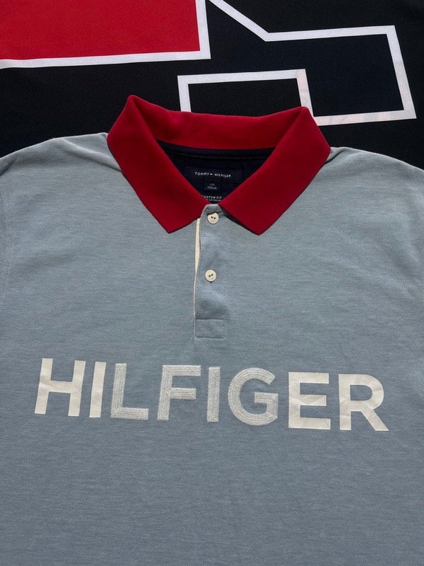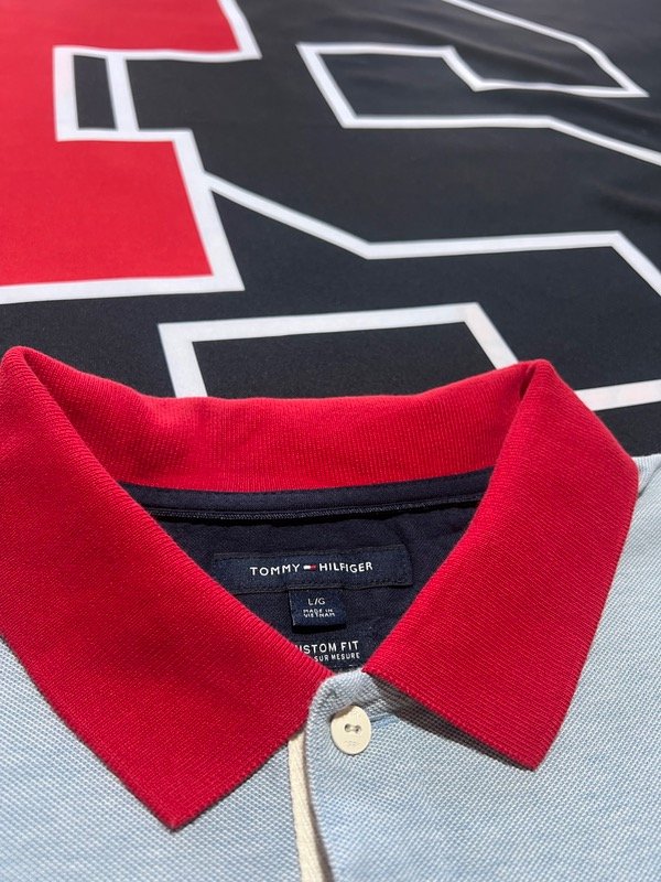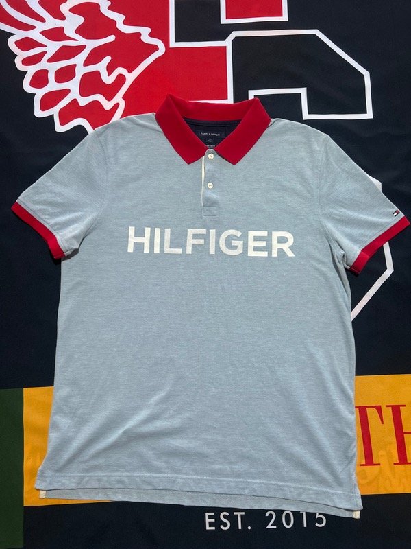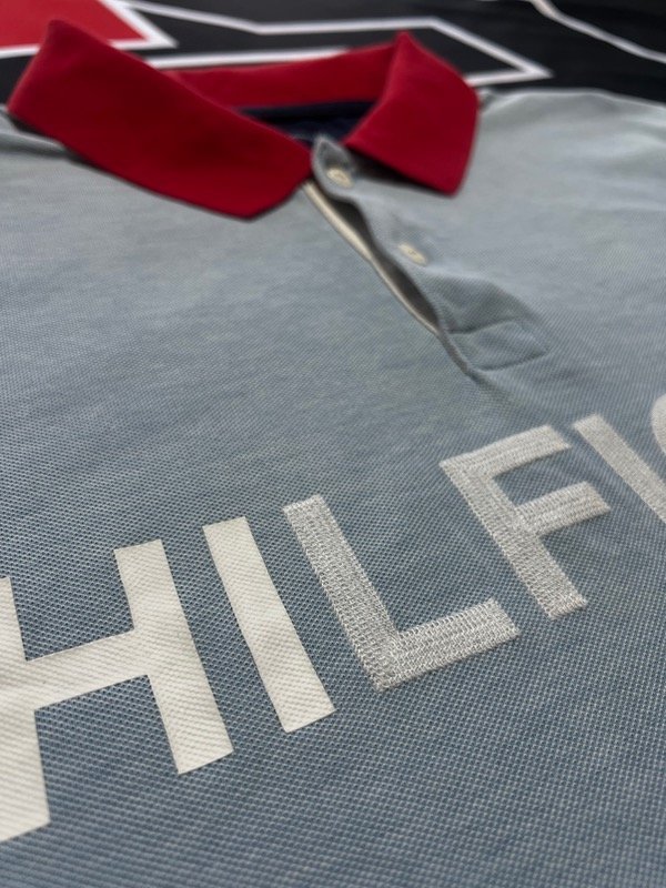 Chomba Tommy Hilfiger Spell out, de piqué, color celeste y roja. Letras mitad estampadas mitad bordadas.